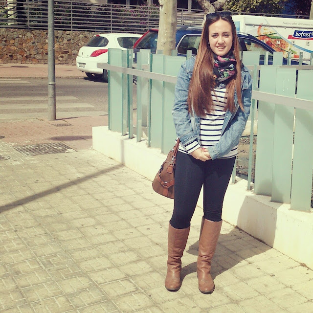Muchas personas son totalmente contrarias a mezclar distintos tipos de estampados o incluso a mezclar negro y marron,yo hoy con este outfit rompo esas reglas,creo que una camiseta marinera fina no queda nada mal con un pañuelo de flores,es mas,me gusta el resultado y que unos leguins negros no se ven mal junto a unas botas y un bolso marron,como no hacia mucho frio he decidido acompañarlo con una chaqueta vaquera y el pelo echado hacia atras con unas gafas de sol,espero que os guste el look,que os parece? Feliz semana!: